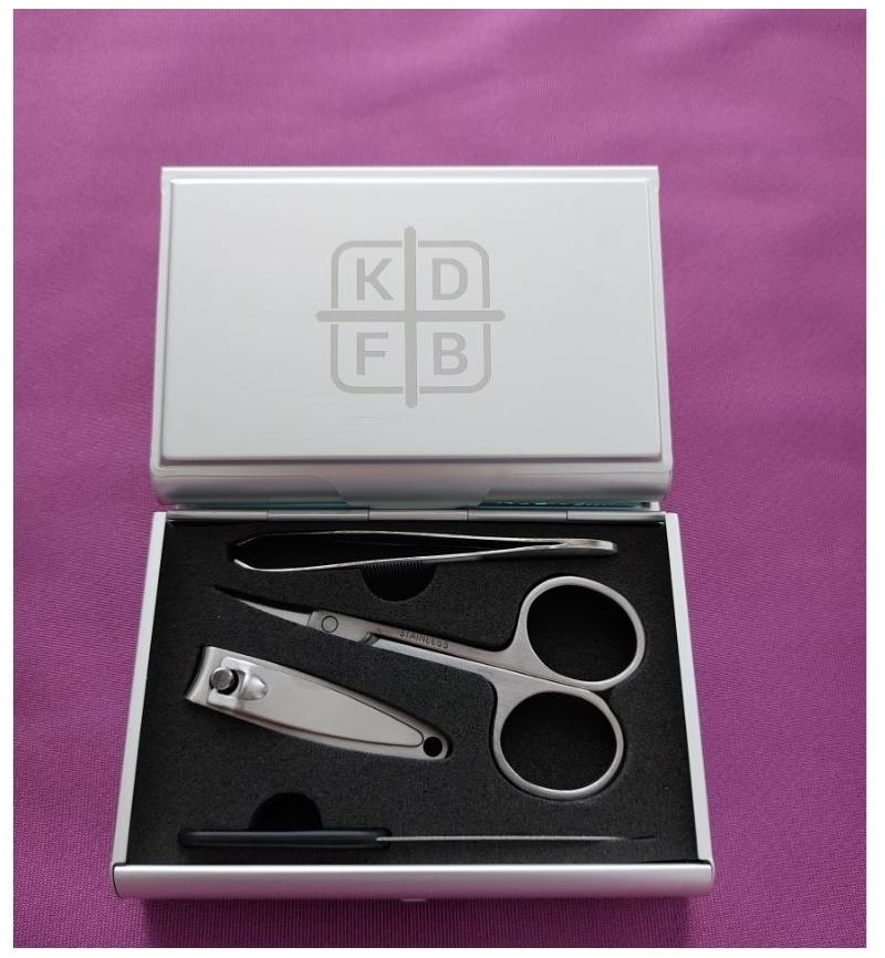 Kleines und kompaktes Manikürset, das in jede Handtasche passt. Die hochwertige Aluminiumdose enthält Nagelfeile, Schere, Nagelknipser, Pinzette und Spiegel. (so lange Vorrat reicht)