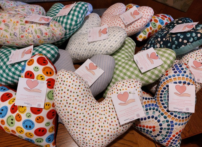 Bereits seit 2018 gibt es die Herzkissenaktion im KDFB. Im Diözesanverband Augsburg engagieren sich seit 2022 zahlreiche Zweigvereine im Rahmen der Aktion mit und haben unzählige Herzkissen liebevoll gefertigt und verteilt. Wir danken allen Zweigvereinen und Unterstützer*innen, die sich an der Aktion beteiligen!